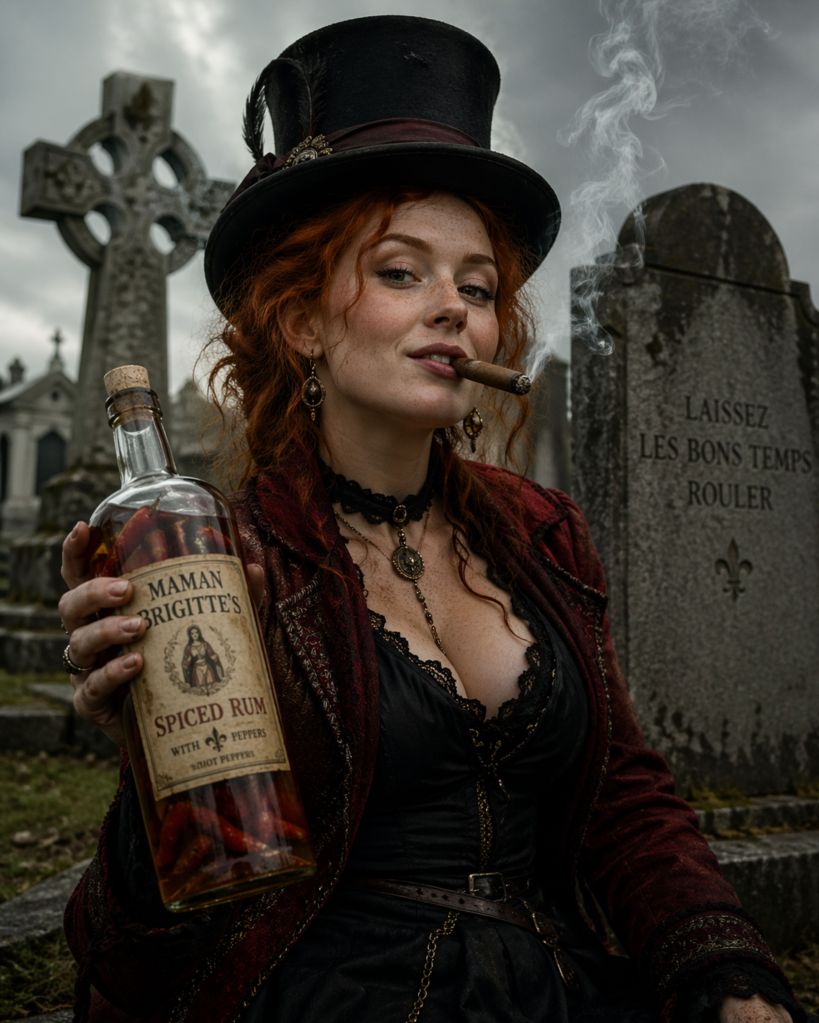 Her imagery alone speaks to her dark goddess nature: red hair like flame, a top hat marking her authority over death, rum infused with hot peppers that burns the throat like truth itself, and the ever-present cemetery—her sacred domain. She drinks, she smokes, she laughs loudly and often profanely, shattering the illusion that the divine must be polished or restrained. Maman Brigitte reminds us that power is not always pretty. Sometimes it is loud, irreverent, and unapologetically wild.